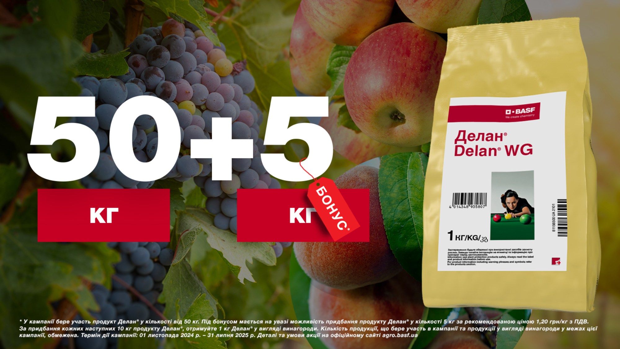 - Делан, в.г. у кількості не менше 50 (п’ятдесят) кілограм, винагорода для Учасника становить 5 (п’ять) кілограм цього продукту. За придбання кожних наступних 10 (десять) кілограм препарату Делан, в.г. Учасник отримує 1 (один) кілограм цього продукту у вигляді винагороди.