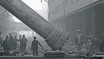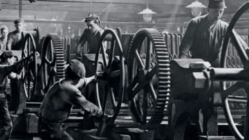 Робітники управляють фільтрпресами вручну, намагаючись максимально висушити барвник індиго на кінцевому етапі виробничого процесу (1921 рік).