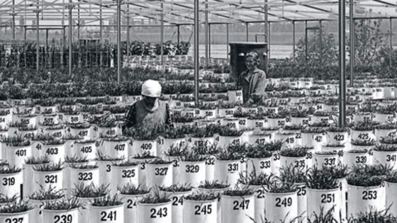 Робітниці доглядають за рослинами на науково-дослідній станції Лімбургерхоф (близько 1925 року). Експерименти, що проводять у горщиках, дають інформацію про вплив добрив на ріст рослин.