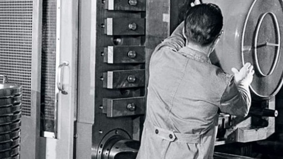 Починаючи з 1960-х років було відкрито багато нових сфер застосування пластмас. На фото відображено виготовлення пластмасових ванн литтям під тиском (1960 рік).