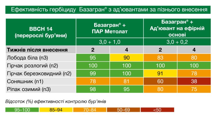 Найвищу ефективність Базагран® має проти бур’янів на початкових фазах росту. Оскільки Базагран® є контактним гербіцидом, а механізм дії бентазону полягає в інгібуванні процесу фотосинтезу, то його ефективність значною мірою буде залежати від норми внесення та якості покриття листків і стебел робочим розчином. Максимальна ефективність досягається за застосування по активно вегетуючих дводольних бур’янах у ранкові часи за сонячної погоди. Важливо, щоб після внесення бур’яни протягом 4–6 годин зазнавали впливу прямих сонячних променів. Адже механізм дії бентазону – це порушення процесу фотосинтезу. Уникайте застосування Базагран® у вечірні часи та в нічний період. Це може суттєво знизити ефективність гербіциду. Також Базагран® є чутливим до температурного режиму. Слід уникати внесення, якщо прогнозується нічне пониження температури нижче +8оС. Оптимальною вважається температура вище +10...+12оС. Істотні опади або полив протягом 6 годин після внесення Базагран® здатні знизитийого ефективність.