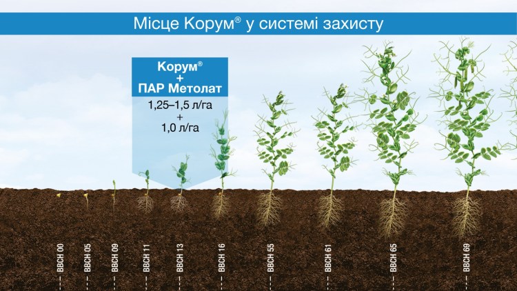 Застосовуючи Корум® у посівах сої й гороху, орієнтуються насамперед на фазу бур’я-ну. Оптимальний контроль досягається, коли однорічні злакові перебуваютьу фазі 1–2 листочки, а дводольні – сім’ядолі – 4–6 листків. У таких випадках, зокремадля контролю лободи білої, достатньою буде норма Корум®, 1,5–1,7 л/га з додаван-ням ПАР Метолат®, 0,75–0,85 л/га. Для знищення чутливих до гербіциду дводольнихбур’янів, які переростають і на момент обприскування мають 3–5 пар справжніх лист-ків, норма Корум® має бути збільшена до 1,8–2,0 л/га + ПАР Метолат®, 0,9–1,0 л/га.