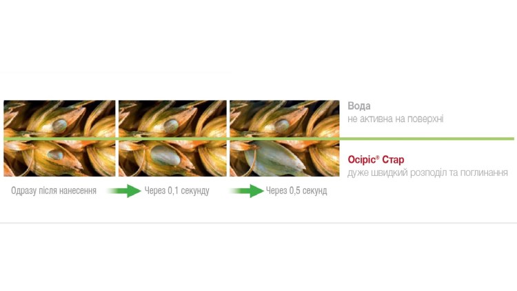 Завдяки унікальним властивостям препарату досягається максимальна площа розподілу Осіріс® Стар поверхнею рослини. Це дає змогу діючим речовинам швидко розподілятися поверхнею колосу та проникати в його внутрішню частину, забезпечуючи ефективний захист. Висока доля прилипачів гарантує швидке поглинання навіть за несприятливих умо в(наприклад, коли наявні товстий восковий шарстарого листя та розвинені колоски).