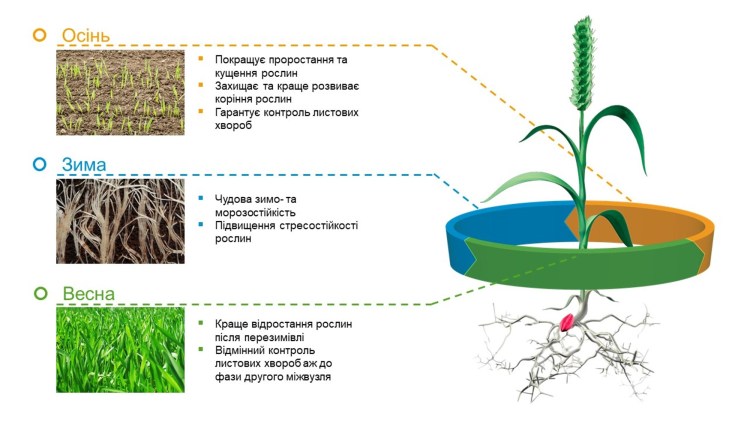 - Фунгіцидна дія проти листкових хвороб при нанесенні на насінину
