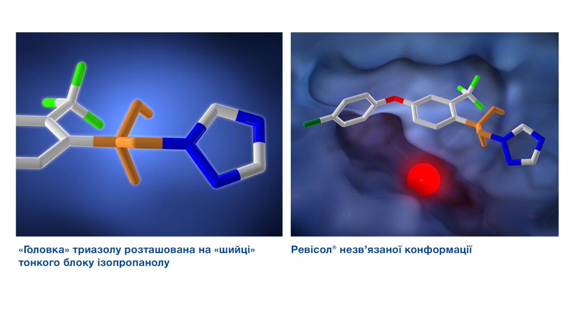 У молекулі Ревісол® «головка» триазолу розміщена на «шийці» гнучкої ізопропанолової сполуки. Така унікальна хімічна особливість молекули дає їй змогу легко мати різні форми – зв’язані і незв’язані. Коли Ревісол® приєднується до активного боку С14-деметилази, він переходить у зв’язану форму, що нагадує «гачок».
