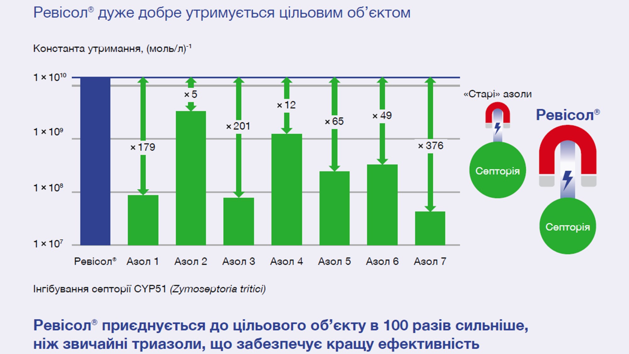 Завдяки гнучкому «гачку» Ревісол® має до 100 разів потужніше зв’язування, ніж звичайні фунгіциди з групи триазолів, навіть там, де вже є пошкодження.