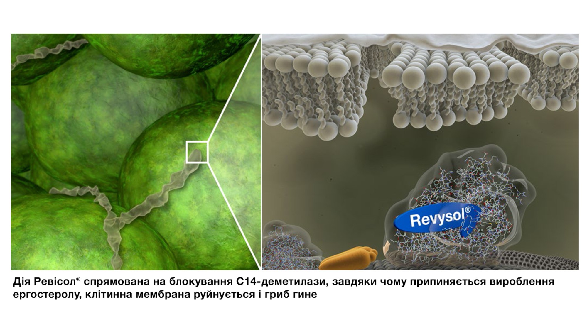 Ревісол® – діюча речовина з хімічної групи ізопропанол-азолів, яка, як і триазоли, за механізмом дії належить до групи інгібіторів деметилювання (DMI). Цільовою ділянкою дії є специфічний фермент С14-деметилаза. Його блокування призводить до порушення синтезу ергостеролу клітинами патогену, а відтак до руйнування цілісності мембран клітин та органел, внаслідок чого патоген гине. Завдяки хімічній будові Ревісол® демонструє вищу ефективність і тривалість захисту порівняно з уже відомими триазолами на ринку.