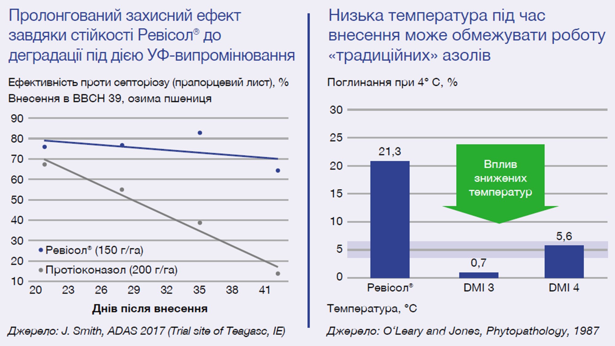 Ревісол® поглинається та ефективно діє навіть за понижених температур (+ 4°C), стійкий до змивання дощем та деградації під дією УФ-випромінювання.