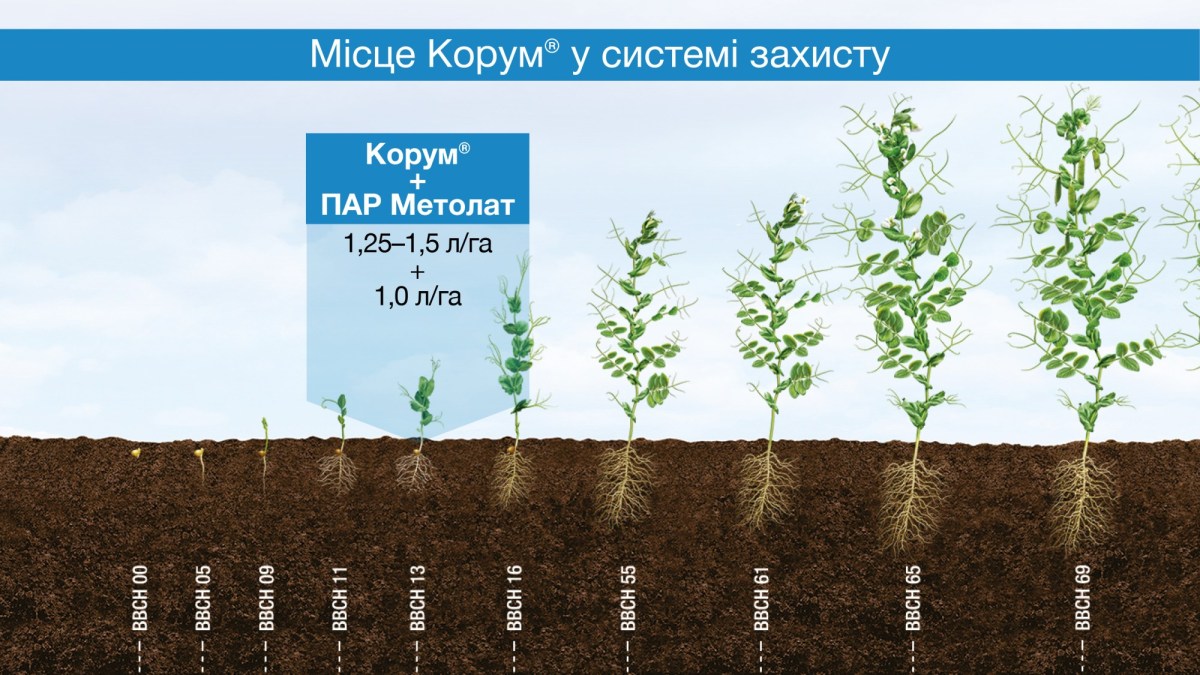 При використанні гербіцидів з групи імідазолінонів, до яких належить і Корум®, слідпам’ятати, що їх потрібно застосовувати на одному полі не частіше 1 разу на 3 роки Застосовуючи Корум® у посівах сої й гороху, орієнтуються насамперед на фазу бур’я-ну. Оптимальний контроль досягається, коли однорічні злакові перебуваютьу фазі 1–2 листочки, а дводольні – сім’ядолі – 4–6 листків. У таких випадках, зокремадля контролю лободи білої, достатньою буде норма Корум®, 1,5–1,7 л/га з додаван-ням ПАР Метолат®, 0,75–0,85 л/га. Для знищення чутливих до гербіциду дводольнихбур’янів, які переростають і на момент обприскування мають 3–5 пар справжніх лист-ків, норма Корум® має бути збільшена до 1,8–2,0 л/га + ПАР Метолат®, 0,9–1,0 л/га. Максимальна ефективність Корум® досягається за застосування у ранкові часи зподальшою активною сонячною інсоляцією впродовж 4–6 годин, що активізує роботуоднієї з діючих речовин – бентазону. При цьому важливо, щоб денні і нічні температу-ри не опускалися нижче 8–10°С, а бур’яни і культура активно вегетували На площах з високим рівнем засміченості однорічними злаковими бур’янами, а такожза ранніх строків сівби сої або гороху ефективним буде послідовне внесення ґрунтовогогербіциду Фронтьєр® Оптіма, 1,0–1,2 л/га і з появою наступної хвилі – Корум®,1,5–1,7 л/га + ПАР Метолат®, 0,75–0,85 л/га. Проти важкоконтрольованих злаковихбур’янів і тих, які перебувають у фазі кущення, варто планувати цілеспрямовануобробку грамініцидами Критично важливим є внесення Корум® виключно з ПАР Метолат® у співвідношенні 2:1 – на дві частини Корум® додавати одну частину ПАР Метолат®. Під час приготу-вання робочого розчину після якісного та інтенсивного перемішування всіх компо-нентів з водою останнім додається ПАР Метолат®. Додавання інших ад’ювантів єнедоцільним, за винятком спеціалізованих пом’якшувачів жорсткої води або сульфа-ту амонію в нормі 2–3 л/100 л води для зв’язування катіонів кальцію і магнію Вода для приготування робочого розчину не має бути жорсткою і повинна мати рН 5,5–6,5