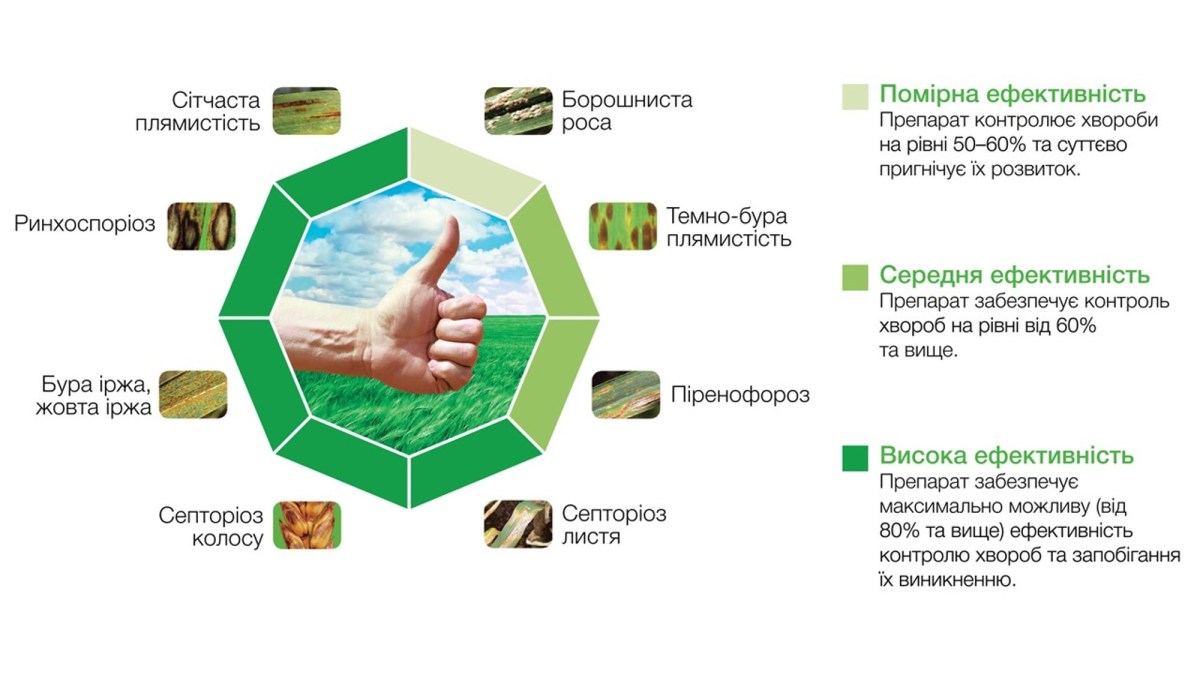Високоефективний фунгіцид для контролю найнебезпечніших хвороб зернових колосових, кукурудзи, сої та цукрових буряків.