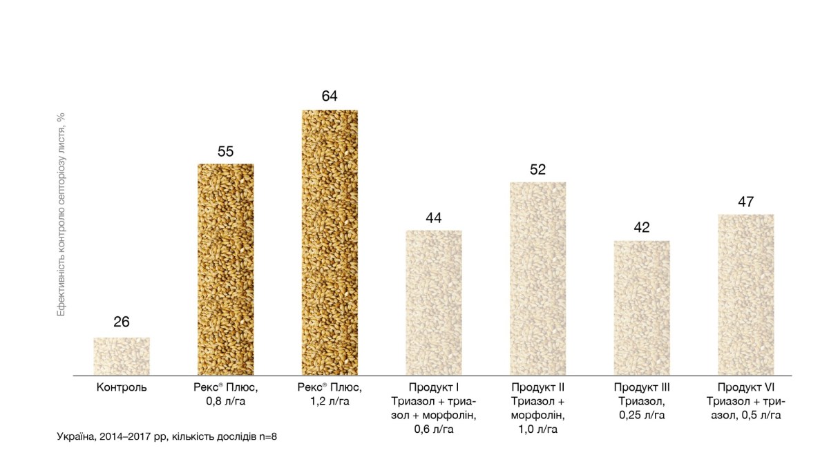 • Контролює широкий спектр хвороб, зокрема борошнисту росу, септоріоз листя, види іржі тощо
