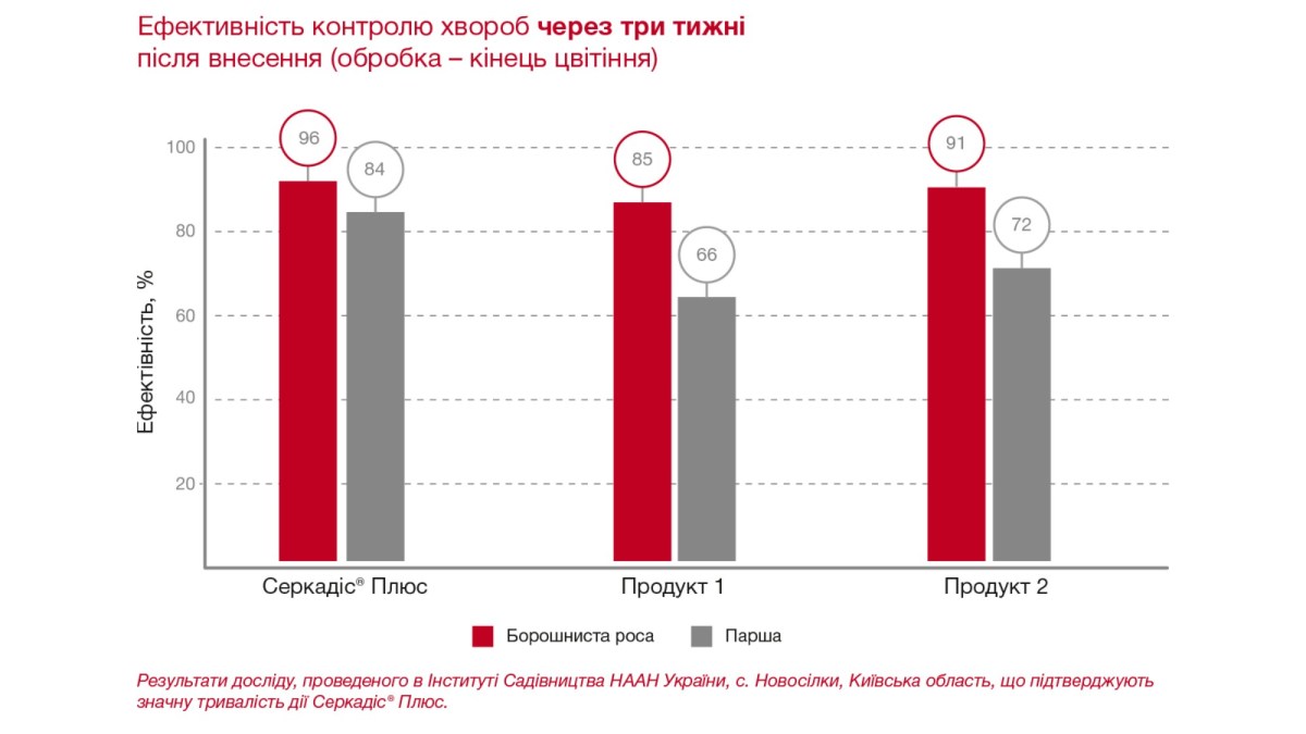 - Профілактична та лікувальна дія щодо основних хвороб яблуні: парші та борошнистої роси, альтернаріозу