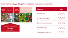 | Черешня | 1,0–1,25 кг/га | перша обробка – початок – середина цвітіння; друга – при досягненні 50–70% величини ягоди | моніліоз, клястероспоріоз, побуріння листя, коккомікоз | 2 |