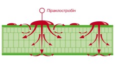 Друга діюча речовина піраклостробін, що належить до нового покоління стробілуринів, здійснює швидкий і тривалий контроль над хворобами, блокуючи виробництво енергії у клітинах гриба на рівні комплексу III, що входить до мітохондріального дихального ланцюга. Піраклостробін сприяє контролю збудників таких хвороб, як борошниста роса, ризоктоніоз, моніліоз, кучерявість листя, відьмина мітла, коккомікоз.