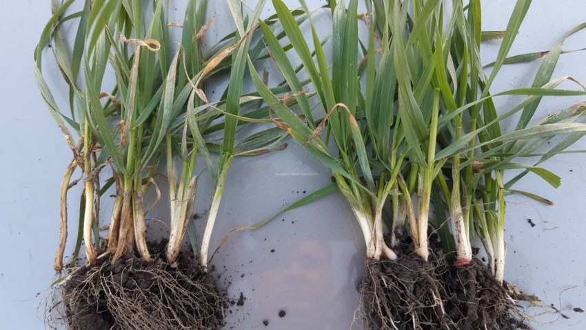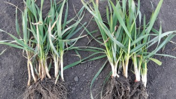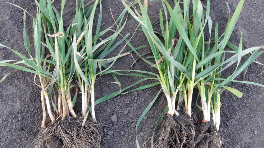 «При обстеженні варіантів досліду було виявлено, що на контролі рівень розвитку снігової плісняви в межах 5 %, що є економічним порогом шкодочинності. На ділянках, оброблених протруйникам Кінто® Плюс - на рівні 1%. На контролі також можна знайти прояви септоріозу та прикореневих гнилей у вигляді побуріння стебел (це чітко видно на фото: контроль ліворуч). З Кінто® Плюс, 1,5л/т – всі рослини чисті (на фото: Кінто® Плюс праворуч). Загалом, стебла більш потужні та здорові, ніж на контролі.