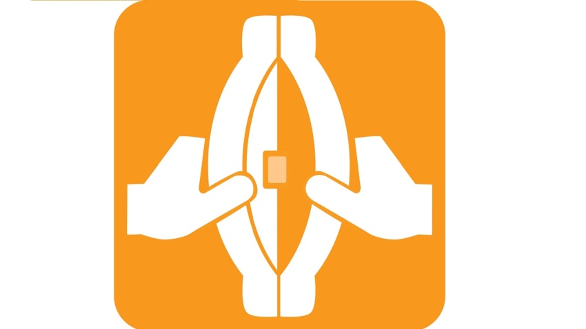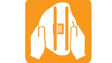 - Дістаньте респіратор з упаковки й утримуйте гумками догори. Помістіть нижню гумку під центральною частиною респіратора, поруч з клапаном.