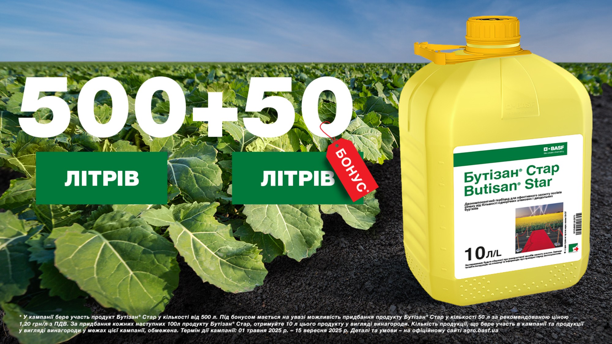Щоб отримати високий врожай та гарну якість насіння ріпаку, важливо вчасно позбутись конкуренції з боку бур’янів. Гербіцид Бутізан® Стар забезпечить ефективний захист посівів від більшості однорічних злакових і дводольних бур'янів. Обирайте Бутізан® Стар у відповідній кількості та отримайте додатковий об’єм препарату в якості бонусу!