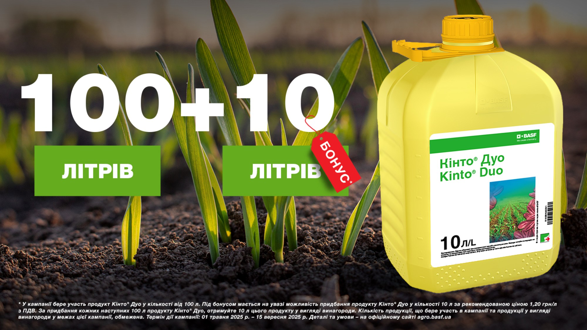 - Кінто® Дуо, КС у кількості не менше 100 (сто) літрів, винагорода для Кінцевого споживача становить 10 (десять) літрів цього продукту. За придбання кожних наступних 100 (сто) літрів препарату Кінто® Дуо, КС Кінцевий споживач отримує 10 (десять) літрів цього продукту у вигляді винагороди;