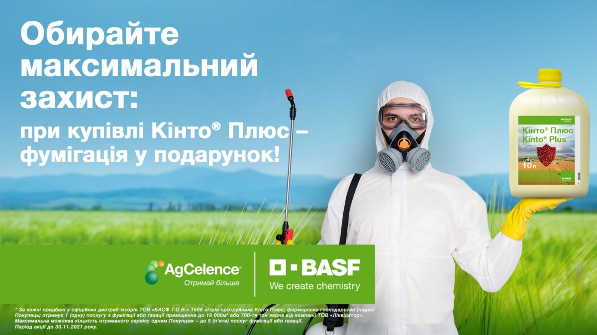 1. За кожні придбані у офіційних дистриб’юторів ТОВ «БАСФ Т.О.В.» 1500 літрів протруйника Кінто® Плюс , фермерське господарство (надалі Покупець) отримує 1 (одну) послугу з фумігації або газації приміщення до 18 000м³ або 700-та тон зерна від компанії ТОВ «Ліквідатор». Максимальна можлива кількість отриманого сервісу одним Покупцем – до 5 (п’яти) послуг фумігації або газації.